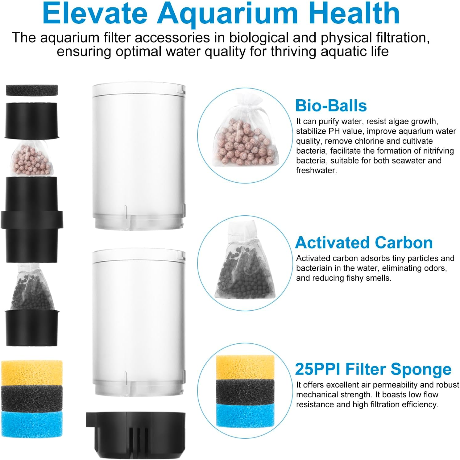 🐟[3 Stage Filteration]: The aquarium filter has 3-stage filtration,chamber with biofiltration ball, activated carbon balls and sponge media, which can filter large particles of impurities such as food residue, fish poops, plant leaves, etc. while adsorbs chlorine and other fine particles to balance the pH value in the tank, providing a clean and healthy aquarium environment, keep your fish healthy and energetic!